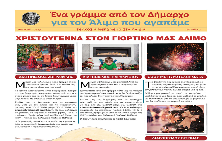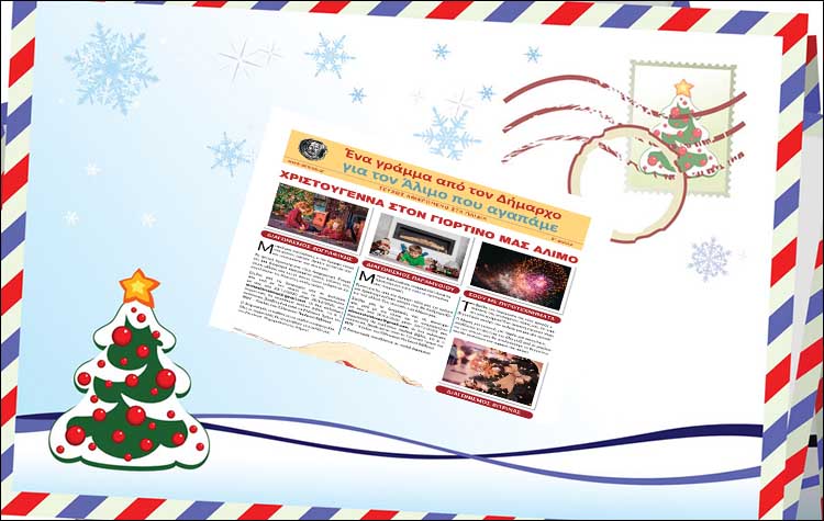 Κυκλοφορεί το Χριστουγεννιάτικο «Γράμμα από τον δήμαρχο» της εφημερίδας του Δήμου Αλίμου, το οποίο είναι εξολοκλήρου αφιερωμένο στα παιδιά! Ενημέρωση για τις Χριστουγεννιάτικες δράσεις στην πόλη, ιδέες για παιχνίδια, ένα παραμύθι – διαγωνισμός, κουΐζ και αρκετά ακόμα, για να κρατήσουν συντροφιά στους μικρούς Αλιμιώτες τις μέρες των γιορτών. «Καλά και δημιουργικά Χριστούγεννα, με πολλή αγάπη κι έμπνευση, στα παιδιά κάθε ηλικίας», εύχεται ο δήμαρχος Αλίμου, Ανδρέας Κονδύλης.