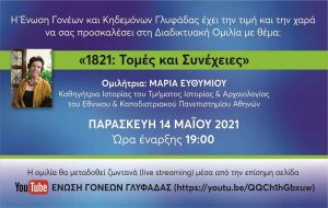 Μια εξαιρετικά ενδιαφέρουσα εκδήλωση διοργανώνει διαδικτυακά η Ένωση Γονέων και Κηδεμόνων του Δήμου Γλυφάδας, την προσεχή Παρασκευή 14 Μάϊου, ανοιχτή σε όλους όσοι επιθυμούν να την παρακολουθήσουν. Η καθηγήτρια Ιστορίας του Τμήματος Ιστορίας και Αρχαιολογίας του Πανεπιστημίου Αθηνών, Μαρία Ευθυμίου, θα αναπτύξει το θέμα: «1821: Τομές και Συνέχειες» και στη συνέχεια θα απαντήσει σε ερωτήσεις τις οποίες θα έχουν τη δυνατότητα να υποβάλουν γραπτώς οι συμμετέχοντες.
