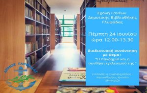 Με το επίκαιρο θέμα: «Η πανδημία και η συνθήκη εγκλεισμού της», ολοκληρώνονται μεθαύριο, Πέμπτη 24 Ιουνίου οι διαδικτυακές συναντήσεις της Σχολής Γονέων της Δημοτικής Βιβλιοθήκης του Δήμου Γλυφάδας, πριν από τις καλοκαιρινές διακοπές. Οι συναντήσεις θα αρχίσουν ξανά τον Σεπτέμβριο. Το θέμα συζήτησης της τελευταίας αυτής συνάντησης, πάντα με την παιδοψυχολόγο μας Χριστίνα Μπογιατζή, τροποποιήθηκε σε