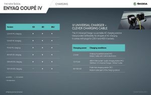 Η SKODA θα προσφέρει το ENYAQ COUPÉ iV σε δύο μεγέθη μπαταρίας και τρεις διαφορετικές εκδόσεις ισχύος. Το ENYAQ COUPÉ iV 60 είναι εξοπλισμένο με μπαταρία ιόντων λιθίου χωρητικότητας 62 kWh (58 kWh net). Ο ηλεκτροκινητήρας παράγει 132 kW (180 PS) και κινεί τους πίσω τροχούς. Το ENYAQ COUPÉ iV 80 έχει επίσης κίνηση στους πίσω τροχούς, με ηλεκτρικό μοτέρ ισχύος 150 kW (204 PS). Όταν είναι εφοδιασμένο με το μεγαλύτερο πακέτο μπαταρίας 82 kWh (77 kWh net) και χάρη στην εξαιρετική αεροδυναμική του αυτοκινήτου με συντελεστή οπισθέλκουσας (Cd) 0,247, αυτή η έκδοση μπορεί να καλύψει περισσότερα από 535 χιλιόμετρα με μία φόρτιση.