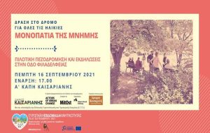 Ο Δήμος Καισαριανής προσκαλεί στη δράση ολοκλήρωσης του προγράμματος “Μονοπάτια της Μνήμης”, που υλοποιείται στο πλαίσιο του Actors of Urban Change, την Πέμπτη 16 Σεπτεμβρίου 2021, στην οδό Φιλαδελφείας.