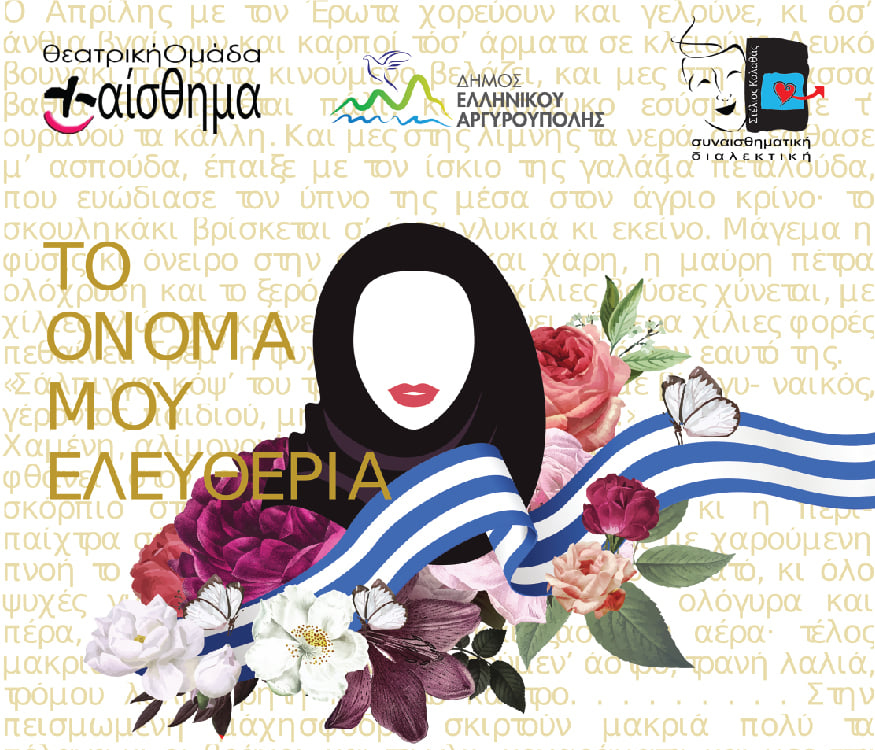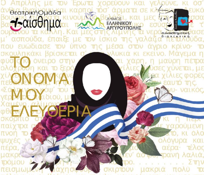 Ο δήμαρχος Γιάννης Κωνσταντάτος και η Πολιτιστική Επιτροπή του Δήμου Ελληνικού – Αργυρούπολης προσκαλούν στην θεατρική παράσταση «Το όνομά μου Ελευθερία» που βασίζεται στο δραματικό ειδύλλιο του Σπυρίδωνος Περεσιάδη , «Εσμέ», σε διασκευή του ηθοποιού και σκηνοθέτη Στέλιου Καλαθά.