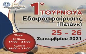 To 1o Tουρνουά Εδαφοσφαίρισης – Πετάνκ συνδιοργανώνεται από τον Δήμο Βάρης Βούλας Βουλιαγμένης και τον σύλλογο Athens Petanque Club, το Σάββατο 25 και Κυριακή 26 Σεπτεμβρίου 2021 και ώρες 18:00-21:00,