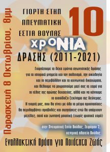 Μετά από τη γιορτή που πραγματοποιήσε ο σύλλογος “Εναλλακτική Δράση για ποιότητα Ζωής” στις αρχές του Σεπτεμβρίου για την επέτειο των δέκα χρόνων από την ίδρυση της Εναλλακτικής Δράσης, την Παρασκευή 8 Οκτωβρίου, στις 7.30μμ στην Πνευματική Εστία Βούλας πραγματοποιεί μια δεύτερη γιορτή σε ένα χώρο με ιδιαίτερη σημασία για την ιστορία του συλλόγου.