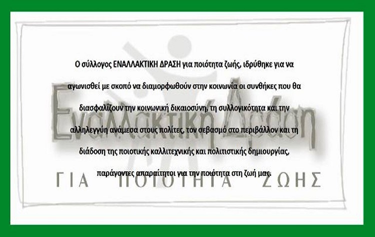 “Διότι στο χώρο αυτό, στις 21 Σεπτεμβρίου 2011, έγινε η ιδρυτική συνέλευση της Εναλλακτικής Δράσης, αφού είχαν προηγηθεί δύο περίπου μήνες συζητήσεων στις μεγάλες κινητοποιήσεις στην Πλατεία Συντάγματος.