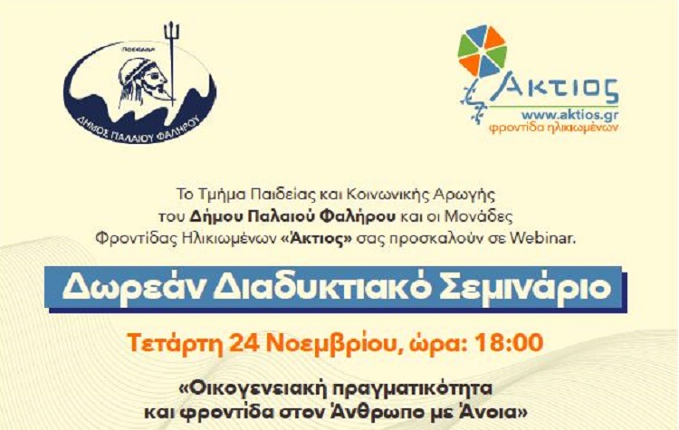 Διαδικτυακό σεμινάριο με θέμα «Οικογενειακή πραγματικότητα και φροντίδα στον Άνθρωπο με Άνοια», διοργανώνει το Τμήμα Παιδείας και Κοινωνικής Αρωγής του Δήμου Παλαιού Φαλήρου και οι Μονάδες Φροντίδας Ηλικιωμένων «Άκτιος».