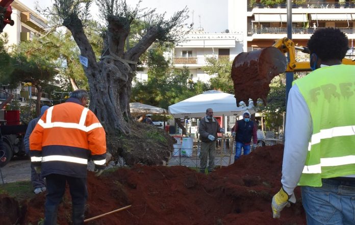 Μία ελιά άνω των 500 ετών, από το Αίγιο, απέκτησε η πλατεία Νέας Σμύρνης. Η μεταφύτευση έγινε σε συνεργασία με την ΕΡΓΟΣΕΕ.