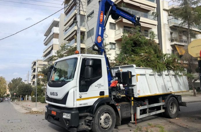 Με εντατικούς ρυθμούς συνεχίζεται η προσπάθεια για τη συλλογή των κλαδιών στη Νέα Σμύρνη.