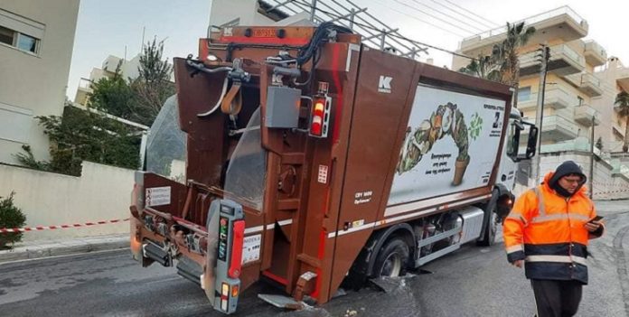 Τρύπησε το οδόστρωμα και βούλιαξε το απορριμματοφόρο.