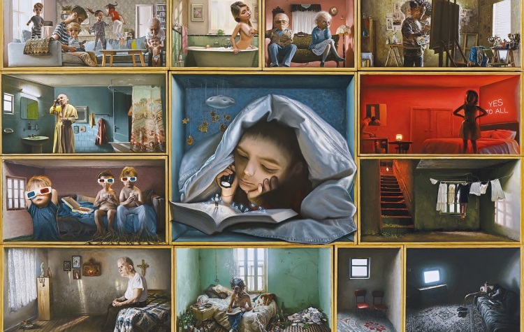 Πρωταγωνιστές είναι άνθρωποι καθημερινοί και το σπίτι είναι το πεδίο όπου εξελίσσεται η σύγχρονη πραγματικότητα πίσω από τις κλειστές πόρτες, τονίζουν οι άνθρωποι του εικαστικού χώρου. Όπως αναφέρουν χαρακτηριστικά, η έννοια του «οίκου» που προστατεύει ως απάγκιο, ενώνει, αλλά μπορεί και να περιορίζει, ακόμη και να συνθλίβει, ζωντανεύει και γίνεται επιφάνεια ζωγραφική. Στις δύο διαστάσεις, με βάση την ίδια οπτική, καθρεφτίζεται ο ζωτικός χώρος όπου ο κόσμος βίωσε τα τελευταία χρόνια την πρωτόγνωρη δοκιμασία του εγκλεισμού υπό το φόβο της αόρατης απειλής.