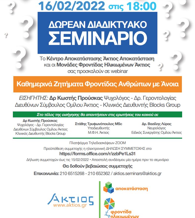 Το Κέντρο Αποκατάστασης «Άκτιος Αποκατάσταση» & οι Μονάδες Φροντίδας Ηλικιωμένων «Άκτιος» διοργανώνουν την Tετάρτη 16 Φεβρουαρίου στις 18.00 δωρεάν ενημερωτικό διαδικτυακό σεμινάριο (webinar) με θέμα «Καθημερινά Ζητήματα Φροντίδας, Ανθρώπων με Άνοια».