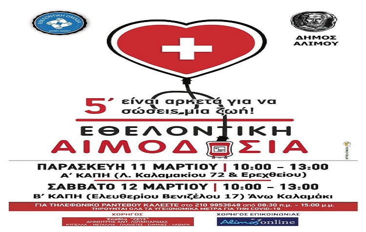Εθελοντική αιμοδοσία θα πραγματοποιηθεί στον Δήμο Αλίμου την Παρασκευή 11 Μαρτίου στο Α΄ΚΑΠΗ, στη συμβολή Λεωφ. Καλαμακίου 72 και Ερεχθείου, από τις 10 π.μ. έως τη 1 μ.μ., και το Σάββατο 12 Μαρτίου στο Β’ ΚΑΠΗ, στην Ελευθερίου Βενιζέλου 17, από τις 10 π.μ. έως τη 1 μ.μ..