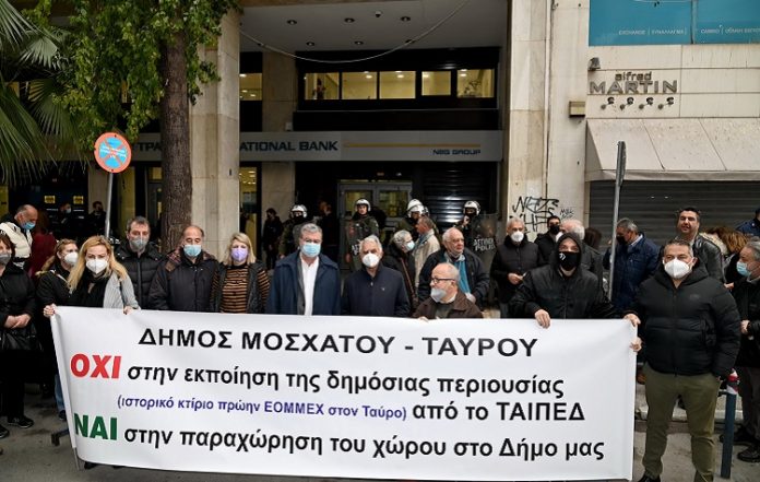 Συγκέντρωση διαμαρτυρίας κατοίκων, με αίτημα να ανακληθεί η απόφαση για εκποίηση του ακινήτου του π. ΕΟΜΜΕΧ από το ΤΑΙΠΕΔ και να παραχωρηθεί στον Δήμο Μοσχάτου-Ταύρου, πραγματοποιήθηκε το πρωί της Πέμπτης έξω από τα γραφεία του Ταμείου στο κέντρο της Αθήνας.
