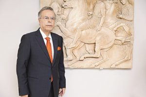 Πάνω στο γραφείο του η κεφαλή της θεάς Υγείας – αντίγραφο του γνήσιου έργου του Σκόπα από το Αρχαιολογικό Μουσείο Τεγέας- τον συντροφεύει στην καθημερινότητά του, από την πρώτη ημέρα ίδρυσης των Εκπαιδευτηρίων «Ο Πλάτων».