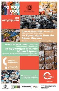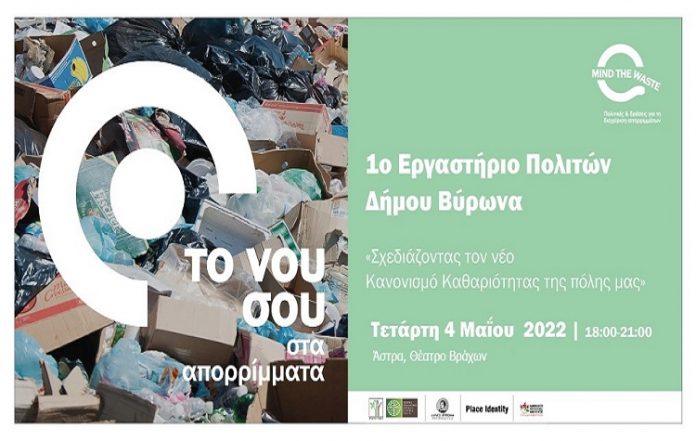 Το πρώτο Συμμετοχικό Εργαστήριο Πολιτών με θέμα «Σχεδιάζοντας τον νέο Κανονισμό Καθαριότητας της πόλης μας», πραγματοποιείται την Τετάρτη 4 Μαΐου, στις 6μμ, στο Άστρα Καφέ. Το Συμμετοχικό Εργαστήριο απευθύνεται σε όλους τους κατοίκους του Δήμου Βύρωνα, σε εργαζόμενους, επιχειρηματίες, μέλη φορέων και συλλογικοτήτων, στελέχη της δημόσιας διοίκησης και αποσκοπεί σε μία ουσιαστική τροφοδότηση για τη σύνταξη του νέου Κανονισμού Καθαριότητας του Δήμου Βύρωνα.