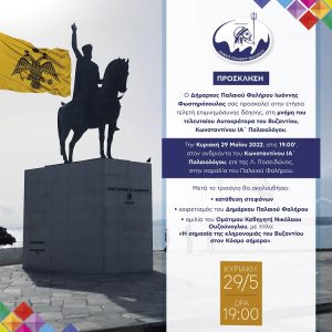Με πρωτοβουλία του δημάρχου Παλαιού Φαλήρου Γιάννη Φωστηρόπουλου, πραγματοποιείται την Κυριακή 29 Μαΐου, στις 7μμ, η ετήσια επιμνημόσυνη δέηση στην μνήμη του τελευταίου Αυτοκράτορα του Βυζαντίου Κωνσταντίνου ΙΑ΄ Παλαιολόγου.