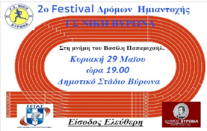 Ο Γυμναστικός Σύλλογος ΝΙΚΗ ΒΥΡΩΝΑ, διοργανώνει Φεστιβάλ δρόμων ημιαντοχής, σε συνεργασία με την ΕΑΣ ΣΕΓΑΣ Αθήνας και την αιγίδα του Δήμου Βύρωνα την Κυριακή 29 Μαΐου και ώρα 7μμ στο Δημοτικό Στάδιο Βύρωνα.