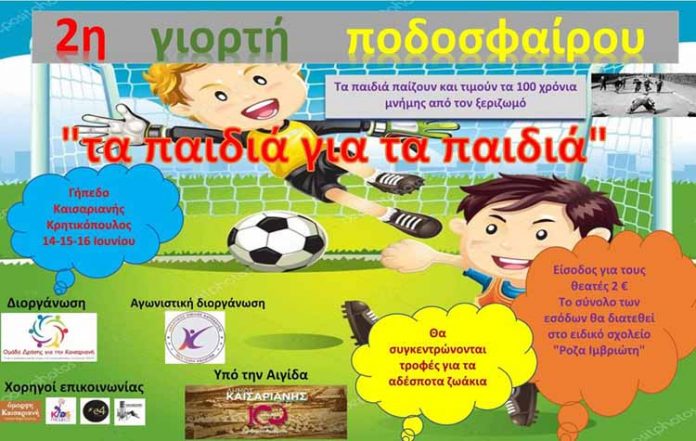 Η Ομάδα Δράσης για την Καισαριανή και η αγωνιστική διοργάνωση Α.Ο. Κατενάτσιο – Νέα Γενιά Αθλητών, υπό την αιγίδα του Δήμου Καισαριανής διοργανώνουν τη 2η Γιορτή Ποδοσφαίρου. Δώδεκα ομάδες από την Καισαριανή και όλη την περιφέρεια Αττικής θα παίξουν φιλικούς αγώνες στο Δημοτικό Στάδιο Καισαριανής «Μιχάλης Κρητικόπουλος», από την Τρίτη 14/6 έως και την Πέμπτη 15/6, μεταξύ 17:00 και 20:30.