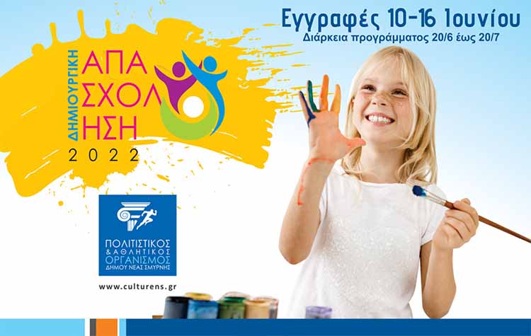 Ξεκινούν οι εγγραφές της Δημιουργικής Απασχόλησης Παιδιών, που διοργανώνει ο Πολιτιστικός και Αθλητικός Οργανισμός του Δήμου Νέας Σμύρνης. Σύμφωνα με τη σχετική ανακοίνωση οι εγγραφές φέτος θα πραγματοποιηθούν διαδικτυακά, ξεκινούν Παρασκευή 10 Ιουνίου και ολοκληρώνονται 16 Ιουνίου .
