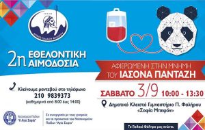 Εθελοντική αιμοδοσία, εις μνήμη Ιάσoνα Πανταζή, με αφορμή την συμπλήρωση 4 χρόνων από την τραγική απώλεια του ταλαντούχου Φαληριώτη αθλητή της υδατοσφαίρισης και του Α.Ο.Π.Φ., σε τροχαίο δυστύχημα, διοργανώνουν η οικογένειά του, με τον Δήμο Παλαιού Φαλήρου και το φιλικό περιβάλλον του.