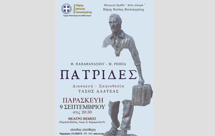 Η παράσταση «Πατρίδες» των Θ. Παπαθανασίου – Μ. Ρέππα, θα παρουσιαστεί σε διασκευή και σκηνοθεσία του Τάσου Αλατζά από τη θεατρική ομάδα «άλλη πλευρά» του Δήμου Βάρης Βούλας Βουλιαγμένης.