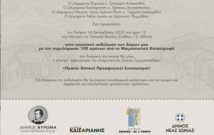 Tην Τετάρτη 14 Σεπτεμβρίου στις 12 το μεσημέρι στην αίθουσα της Παλαιάς Βουλής των Ελλήνων (Σταδίου 13), στο πλαίσιο των εκδηλώσεων μνήμης για τα 100 χρόνια από τη Μικρασιατική Καταστροφή, θα πραγματοποιηθεί η παρουσίαση της Αναμνηστικής Σειράς Γραμματοσήμων με θέμα τη δημιουργία των τεσσάρων πρώτων, μετά το 1922, αστικών προσφυγικών συνοικισμών της χώρας: Βύρωνα, Καισαριανής, Νέας Κοκκινιάς και Νέας Ιωνίας.