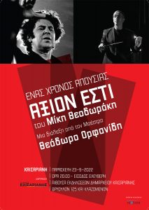 Ο Δήμος Καισαριανής τιμώντας την επέτειο του ενός έτους από τον θάνατο του μεγάλου Μίκη Θεοδωράκη, σας προσκαλεί στη διάλεξη με τίτλο: «Άξιον Εστί του Μίκη Θεοδωράκη –