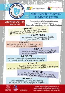 Οι παραστάσεις του Διαδημοτικού Φεστιβάλ θα φιλοξενηθούν στο Πολιτιστικό Κέντρο «Θεόδωρος Αγγελόπουλος» στο Μοσχάτο, Κωνσταντινουπόλεως και Σολωμού, στις 20.15, με ελεύθερη είσοδο.