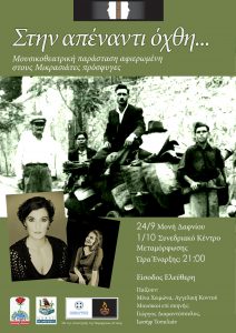 Μια πρωτότυπη μουσικοθεατρική παράσταση του καλλιτεχνικού οργανισμού Altera Pars αφιερωμένη στους Μικρασιάτες πρόσφυγες, τις δύσκολες, αλλά και γοητευτικές ιστορίες τους, τις γεύσεις, τις μυρωδιές και τις μελωδίες τους, που μπόλιασαν στην ελληνική κοινωνία, διαμορφώνοντας τη φυσιογνωμία της σύγχρονης Ελλάδας.