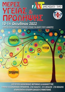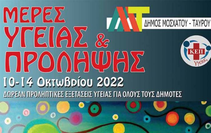 Ο Δήμος Μοσχάτου -Ταύρου διοργανώνει τη δράση «Μέρες Υγείας και Πρόληψης» από τις 10 έως τις 14 Οκτωβρίου 2022. Η διοργάνωση αυτή έχει ως στόχο την ευαισθητοποίηση των συμπολιτών μας σε θέματα που αφορούν τη σωματική και ψυχική τους υγεία.