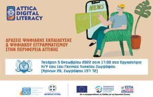 H Περιφέρεια Αττικής, σε συνεργασία με τον Δήμο Ζωγράφου ξεκινάει την Τετάρτη 05 Οκτωβρίου 2022 (17:00) στο Εργαστήριο Η/Υ του 1ου Γενικού Λυκείου Ζωγράφου (Κρίνων 26, Ζωγράφου 157 72) τα δια ζώσης σεμινάρια, στο πλαίσιο του έργου «Δράσεις Ψηφιακής Εκπαίδευσης και Ψηφιακού Εγγραμματισμού στην Περιφέρεια Αττικής» (Ε.Π. «Αττική 2014-2020») σύμφωνα πάντα με τις οδηγίες από τον Ε.Ο.Δ.Υ. κατά του COVID-19.