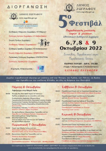 Συγκεκριμένα, ο Δήμος Ζωγράφου, το Ν.Π.Δ.Δ. Πολιτισμού & Αθλητισμού του Δήμου και οι Πολιτιστικοί Σύλλογοι της πόλης ( Σύνδεσμος Ηπειρωτών Ζωγράφου «Η Ήπειρος», Σύλλογος Κρητών Ζωγράφου «Ο Καζαντζάκης», Ένωση Ποντίων Ζωγράφου, Σύνδεσμος Παλαιών Ζωγραφιωτών, Σύνδεσμος Αρκάδων Ζωγράφου «Θ. Κολοκοτρώνης», Ένωση Ηπειρωτών Ζωγράφου «Απειρωτάν», Πολιτιστικός Σύλλογος Ζωγράφου «Παυσίλυπον», Σύλλογος Θρακιωτών Ζωγράφου) σας προσκαλούν σε ένα τετραήμερο διασκέδασης και περιήγησης στα έθιμα της Ελλάδας, στο 5ο Φεστιβάλ Παραδοσιακής Μουσικής, Χορών και Γεύσεων Εθνικοτοπικών Συλλόγων Δήμου Ζωγράφου, που θα πραγματοποιηθεί στις 6,7, 8 και 9 Οκτωβρίου 2022, στο Πάρκο Γουδή. Ώρα έναρξης των εκδηλώσεων τις 7:00 μ.μ.