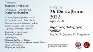 28ης Οκτωβρίου, σας προσκαλεί την Τετάρτη 26 Οκτωβρίου 2022, στις 8:00 μ.μ. ,στον Δημοτικό Πολιτιστικό Πολυχώρο «Αλέκα» (Γ’ Ορεινής Ταξιαρχίας 13), στη μουσική εκδήλωση – αφιέρωμα στο Έπος του ’40 «Πως πολεμούν οι Έλληνες για την Ελευθερία τους». Η είσοδος για το κοινό είναι ελεύθερη. Σημειώνεται ότι για την ομαλή και ασφαλή είσοδο στον Δημοτικό Πολυχώρο «Αλέκα», συνίσταται η έγκαιρη προσέλευση (30 λεπτά πριν την έναρξη της εκδήλωσης).