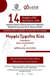 Η εκδήλωση θα γίνει τη Δευτέρα 14 Νοεμβρίου στις 18.00 στο Δημαρχείο Βύρωνα, Αίθουσα Δημοτικού Συμβουλίου (Καραολή & Δημητρίου 36 – 44, Βύρωνας 16233) και πραγματοποιείται με αφορμή την Παγκόσμια Ημέρα Εξάλειψης της Βίας κατά των Γυναικών (25 Νοεμβρίου).