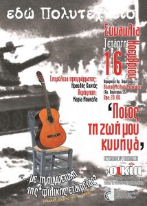 Τιμώντας τη μνήμη του Πολυτεχνείου, ο Οργανισμός Πολιτισμού, Αθλητισμού και Περιβάλλοντος του Δήμου Αγίου Δημητρίου και ο Σύλλογος +Οικία Άγιος Σπυρίδωνας συνδιοργανώνουν την εκδήλωση «Ποιος τη ζωή μου κυνηγά;» με τη συμμετοχή της μουσικής μπάντας της +Οικίας, “Φιλική Εταιρεία”, στο Δημοτικό Θέατρο «Μελίνα Μερκούρη» (Αγ. Δημητρίου 55), την Τετάρτη 16 Νοεμβρίου 2022 και ώρα 20:00, με ελεύθερη είσοδο.