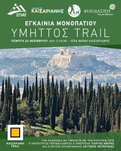 Σε χρήση δίδεται επισήμως το μητροπολιτικό πεζοπορικό μονοπάτι «ΥΜΗΤΤΟΣ TRAIL», με τα εγκαίνια, αύριο Πέμπτη 24 Νοεμβρίου, των πρώτων 15 χιλιομέτρων που φέρουν την ονομασία «ΚΑΙΣΑΡΙΑΝΗ TRAIL» και βρίσκονται στην καρδιά του δάσους της Καισαριανής.