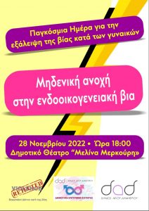 Ενημερωτική εκδήλωση με τίτλο “Διατομεακή Ανταπόκριση στην Ενδοοικογενειακή Βία: Μπορεί να επιτευχθεί;”, διοργανώνει ο Δήμος Αγίου Δημητρίου με αφορμή την Παγκόσμια Ημέρα για την εξάλειψη της βίας κατά των γυναικών. Η εκδήλωση θα πραγματοποιηθεί τη Δευτέρα 28 Νοεμβρίου, στις 6μμ, στο Δημοτικό Θέατρο “Μελίνα Μερκούρη”.