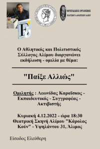 ομιλητή τον εκπαιδευτικό, ακτιβιστή και συγγραφέα του «ΕΥ» Λεωνίδα Καραΐσκο.