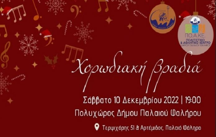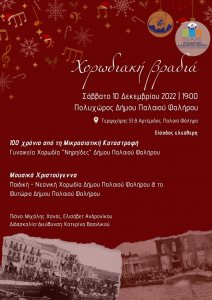 Xορωδιακή βραδιά με τίτλο «100 χρόνια από τη Μικρασιατική Καταστροφή» διοργανώνει ο Δήμος Παλαιού Φαλήρου το απόγευμα του Σαββάτου 10 Δεκεμβρίου στον Πολυχώρο του Δημαρχείου με την συνδρομή του Πολιτιστικού Αθλητικού Κέντρου της πόλης.