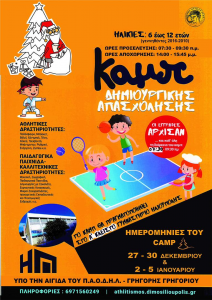 Οι εκδηλώσεις που απευθύνονται σε όλα τα παιδιά ηλικίας από 6 ως 12 ετών θα πραγματοποιηθούν στο Α’ Κλειστό Γυμναστήριο Ηλιούπολης  με κόστος 5 ευρώ/ημέρα, θα γίνουν παρουσία γιατρού στους χώρους δραστηριοτήτων και περιλαμβάνει: Ποδόσφαιρο, Μπάσκετ, Βόλεϊ, Χάντμπολ, Τένις, Χόκεϋ, Ταεκβοντό, Μπάντμιντον, Ρυθμική, Ενόργανη, Zumba κ.ά.Παιδαγωγικά Παιχνίδια, Δημιουργίες με Σοκολάτα, Εορταστικές Κατασκευές, Μικροί Ζαχαροπλάστες, προαιρετικές Εκπαιδευτικές και Ψυχαγωγικές Εκδρομές κ.ά.