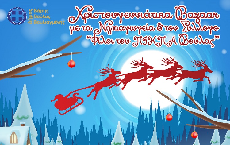 Τα Νηπιαγωγεία του Δήμου Βάρης Βούλας Βουλιαγμένης και ο “Σύλλογος Φίλων ΠΙΚΠΑ Βούλας” περιμένουν κάθε ενδιαφερόμενο στο Χριστουγεννιάτικο Χωριό στο πάρκο του Αγίου Ιωάννη στη Βούλα, για να παρουσιάσουν τις καλλιτεχνικές τους δημιουργίες μέσα από τις εκθέσεις και τα bazaar τους.