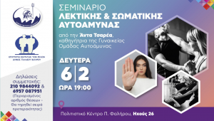 Με την συνδρομή της επιτροπής Ισότητας των Φύλων, από τον Δήμο Π. Φαλήρου, διοργανώνεται στο Πολιτιστικό Κέντρο «Σεμινάριο Λεκτικής & Σωματικής Αυτοάμυνας». Στο σεμινάριο θα διδάξει η καθηγήτρια της Γυναικείας Ομάδας Αυτοάμυνας Άντα Τσαρέα.