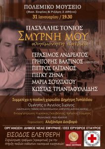 Πέρασαν 100 χρόνια από τη Μικρασιατική Καταστροφή. Ο Δήμος Νέας Σμύρνης, γεννημένος από τις στάχτες της Ιωνίας, δεν ξεχνά. Επιμένει να θυμάται και να κρατά τις μνήμες ζωντανές με κάθε τρόπο. Την Τρίτη 31 Ιανουαρίου, στις 19.30, ο Πασχάλης Τόνιος παρουσιάζει τη νέα του σύνθεση, ένα μουσικό ποιητικό έργο, με τίτλο “Σμύρνη μου, Αλησμόνητη πατρίδα”, στο Πολεμικό Μουσείο της Αθήνας.