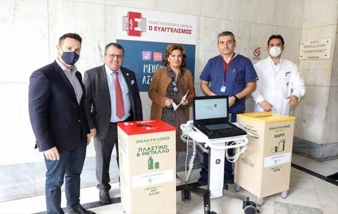 Στο πλαίσιο της δωρεάς, η εταιρεία ΤΕΧΑΝ τοποθέτησε σε καίρια σημεία του Γ.Ν.Α. «ΕΥΑΓΓΕΛΙΣΜΟΣ» 10 ειδικούς κάδους ανακύκλωσης, σε συνεργασία με το Εθνικό Συλλογικό Σύστημα Εναλλακτικής Διαχείρισης Συσκευασιών «ΑΝΤΑΠΟΔΟΤΙΚΗ ΑΝΑΚΥΚΛΩΣΗ» για διαλογή στην πηγή και ανταποδοτικό κίνητρο για τις συσκευασίες που ανακυκλώνονται.
