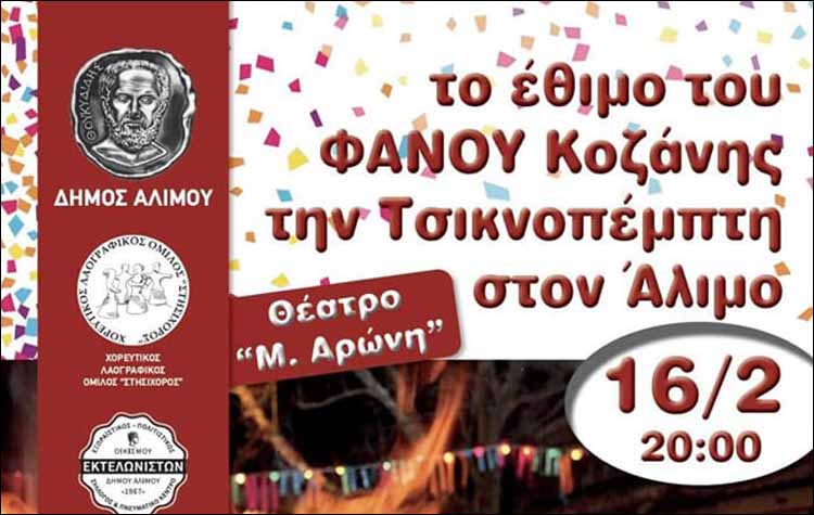 Ο Δήμος Αλίμου προσκαλεί τους πολίτες της πόλης να γιορτάσουν την Τσικνοπέμπτη μαζί. Συγκεκριμένα η σχετική ανακοίνωση αναφέρει: «Γιορτάζουμε την Τσικνοπέμπτη 16 Φεβρουαρίου 2023 με την αναπαράσταση του «Εθίμου των Φανών» και δωρεάν κέρασμα για όλους