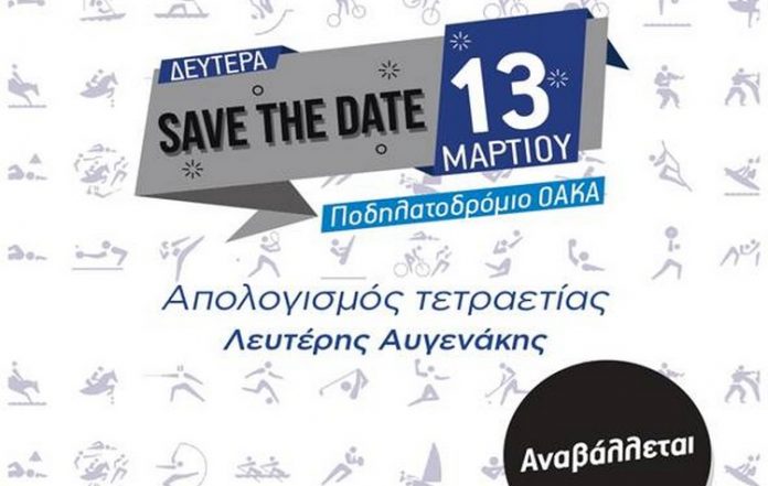 Από το Γραφείο Τύπου του υφυπουργού αθλητισμού, Λευτέρη Αυγενάκη ανακοινώθηκε ότι λόγω των τραγικών γεγονότων που βιώνει η χώρα μας, αναβάλλεται η προγραμματισμένη για τις 13 Μαρτίου εκδήλωση απολογισμού της τετραετίας του κ. Αυγενάκη στο Ποδηλατοδρόμιο του ΟΑΚΑ.