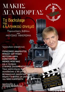 Παράσταση – εκδήλωση για τον ελληνικό κινηματογράφο διοργανώνει τη Δευτέρα 27 Μαρτίου και ώρα 8 μ.μ στο Δημοτικό Κινηματοθέατρο «Μελίνα Μερκούρη» (Γ. Γεννηματά και Ανατ. Ρωμυλίας 123) ο Δήμος Γλυφάδας, με αφορμή την κυκλοφορία του νέου βιβλίου του Μάκη Δελαπόρτα «Τα Backstage του ελληνικού σινεμά» από τις εκδόσεις Άγκυρα.