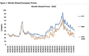 Εικόνα 1. Η απόκλιση του δείκτη TTF στη διάρκεια της ενεργειακής κρίσης. The Oxford Institute for Energy Studies. The Consequences of Capping the TTF Price. October 2022.