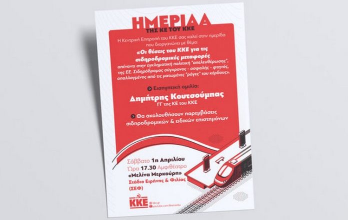 Η ΚΕ του ΚΚΕ το Σάββατο 1η Απριλίου οργανώνει, στο αμφιθέατρο «Μελίνα Μερκούρη» στο ΣΕΦ, ημερίδα με θέμα «Οι θέσεις του ΚΚΕ για τις σιδηροδρομικές μεταφορές απέναντι στην εγκληματική πολιτική “απελευθέρωσης” της ΕΕ. Σιδηρόδρομος σύγχρονος – ασφαλής – φτηνός, απαλλαγμένος από τις ματωμένες “ράγες” του κέρδους».