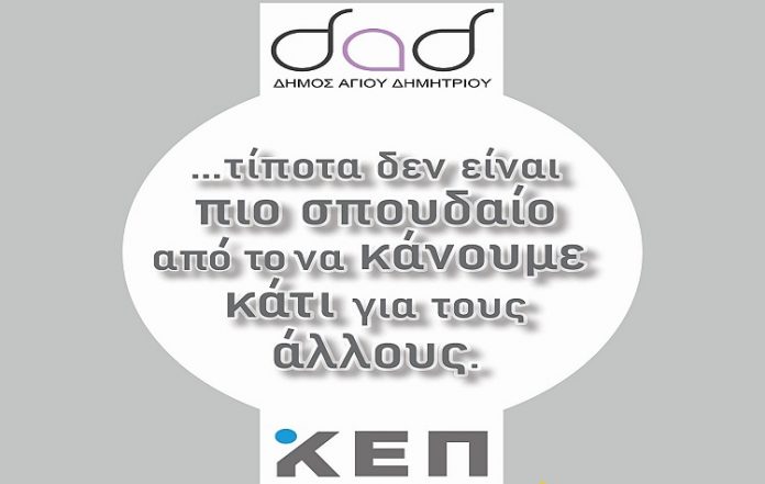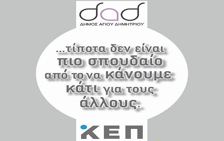 Όπως αναφέρει η δήμαρχος Αγίου Δημητρίου, Μαρία Ανδρούτσου «κατά τον Μάρτιν Λούθερ Κινγκ: Η πιο επίμονη και επείγουσα ερώτηση στη ζωή είναι: «τι κάνεις για τους άλλους;» Αυτή ακριβώς η επίμονη και επείγουσα ερώτηση «γέννησε» και το έντυπο του ΚΕΠ. Οι υπηρεσίες που προσφέρουν τα ΚΕΠ, το City Agenda, τα ηλεκτρονικά αιτήματα… Ο Δήμος μας γίνεται κάθε μέρα καλύτερος, πιο προσβάσιμος, ποιοτικότερος, περισσότερο φιλικός. Κι όλα ξεκινούν από… και καταλήγουν στον πολίτη. Ο πολίτης και η καλύτερη εξυπηρέτησή του είναι ο γνώμονας, η πυξίδα και το ταξίδι μας…»